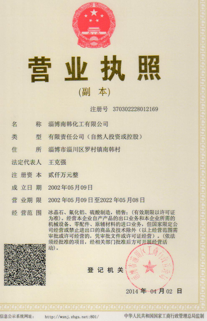 淄博南韓化工有限公司位于淄博市淄川區(qū)羅村鎮(zhèn)南韓村,注冊資本為2000萬元,始建于1995年,原名為淄川區(qū)南韓社會福利化工廠,2002年改制成淄博南韓化工有限公司,占地面積為23000平方米,現(xiàn)有職工300余人,各類工程技術(shù)管理人員80余人。目前主要從事氟化鋁、擬薄水鋁石的生產(chǎn)和銷售。 公司工藝完善,技術(shù)力量雄厚,氟化鹽和擬薄水鋁石系列產(chǎn)品各項(xiàng)指標(biāo)均達(dá)到標(biāo)準(zhǔn)。國內(nèi)用戶遍布20多個省市和地區(qū),并出口美國、韓國、日本、東南亞等國。 公司以科學(xué)的管理,致力于構(gòu)建節(jié)能、安全、環(huán)保企業(yè)文化,以穩(wěn)定的質(zhì)量、完善的服務(wù)、合理的價格贏得客戶的信賴,董事長王克強(qiáng)先生愿與各界同仁共創(chuàng)美好的未來!
